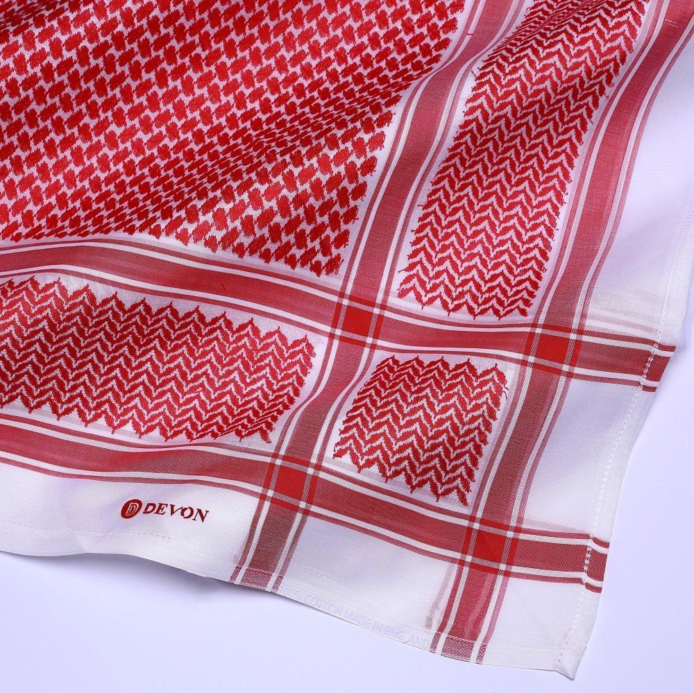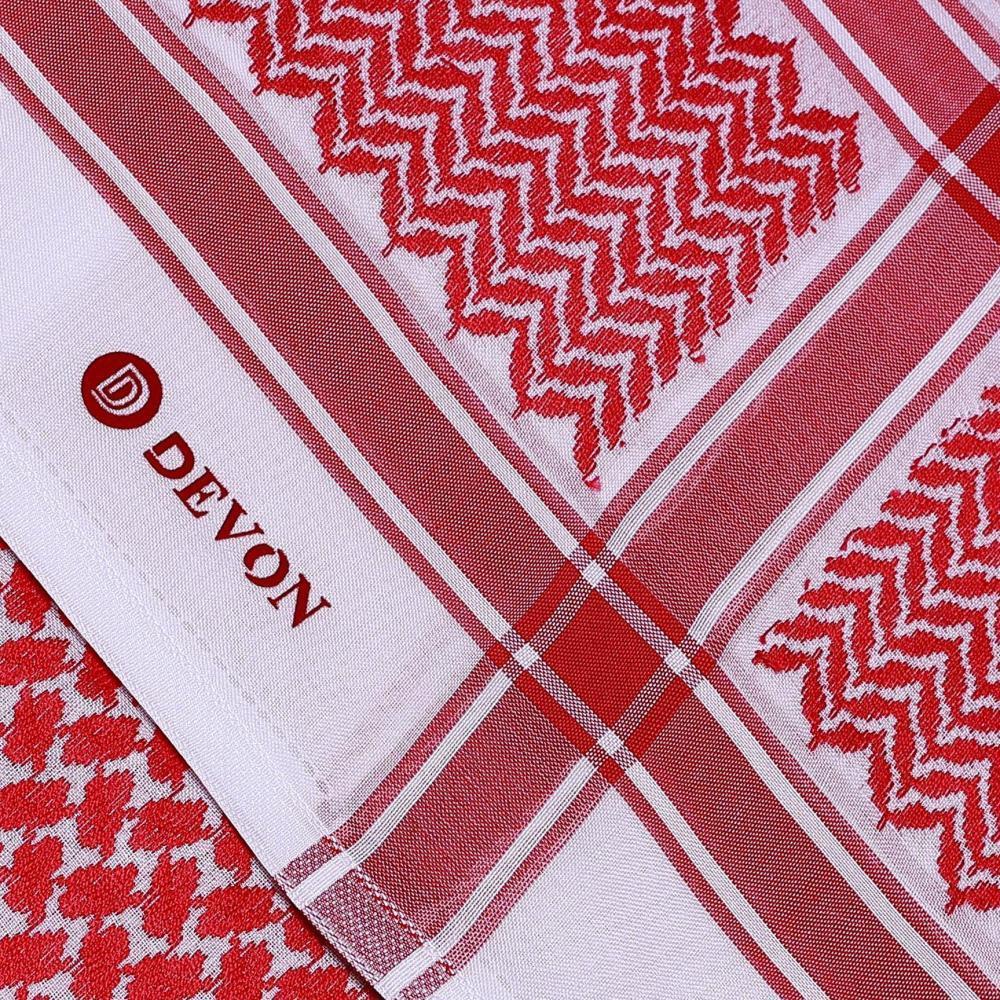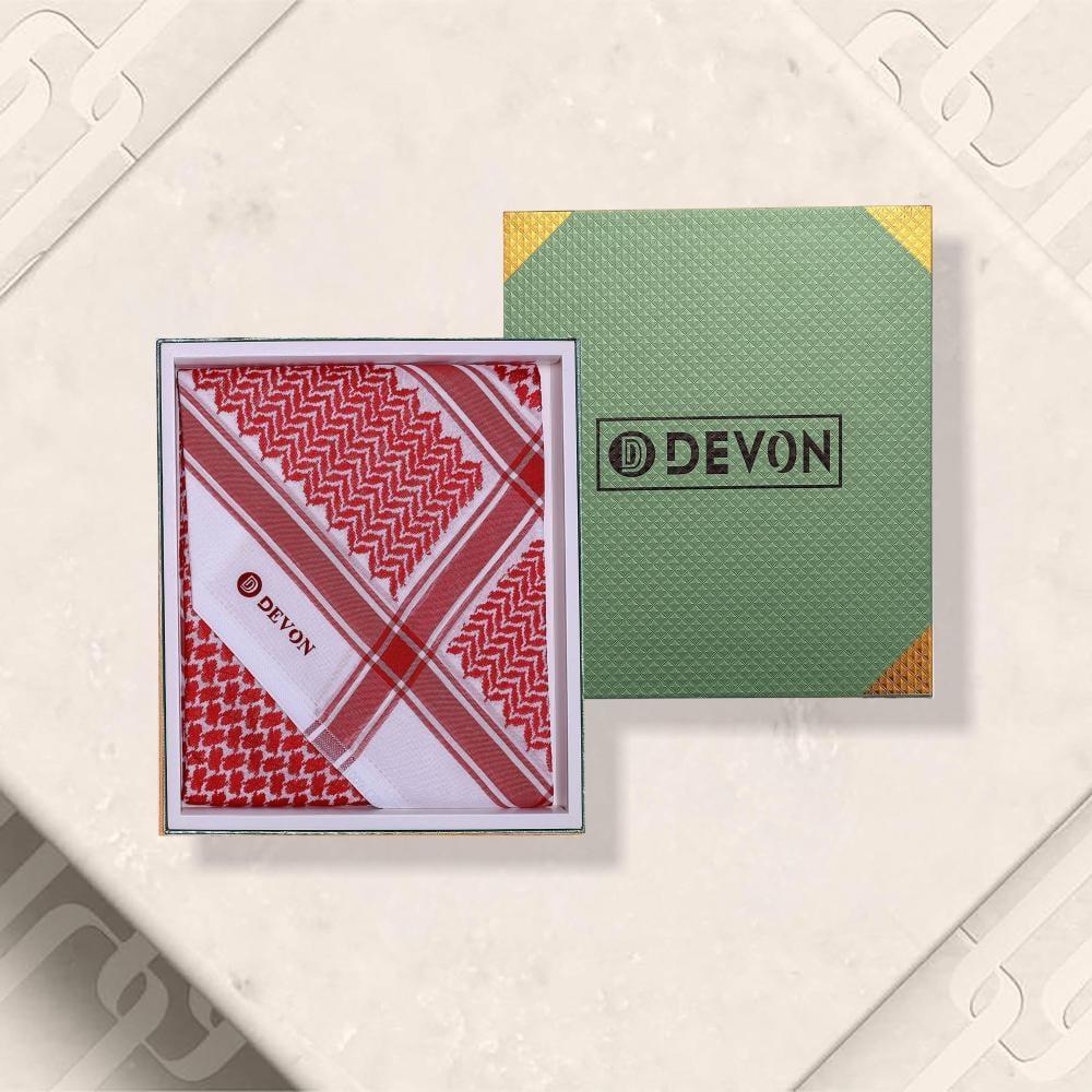 شماغ احمر فاخر من ماركة ديفون DEVON، ديفون شماغ يجمع بين الأصالة والأناقة تم تصميمه بمعايير أوروبية في صناعة الشماغ الأصلي والذي يمنحك مظهراً انيقاً ومصنوعة من خيوط ناعمة ودقيقة